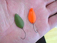 この日のアタリカラーのオリーブと蛍光オレンジ。オレンジで高反応でしたが、ショートバイトが多くのらなかったのでオリーブにカラーチェンジした所、一投目で50オーバーの綺麗なニジマスがヒットしました。色が合ってなかったんでしょうね