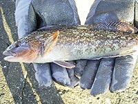 その数分後、西川君のロックフィシュボトムMが激曲がり!! 西川君:「で、でかいよ(汗)」慎重にネットインして上がってきたのはこの日、最大の47cm!西川君:「すげ〜浅い場所だよ!、2mか3mぐらいのとこできたヨ!」ちょっとアセリながらも西川君と同じリグに変更。
