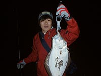 暗くてどこまで寄せれたかも分からず…「大きいか?」って聞かれても、「多分…」(汗) ようやく岸際まで寄せて魚を先に見た旦那は「デッケー!!」イイ具合に波も無く旦那がオーシャングリップで無事キャッチ!その時初めて魚を見てビックリ〜しっかりと岡ジグをくわえてましたよ〜(涙) 55p人生最大魚です。オーシャングリップも魂入りましたv(^^)v