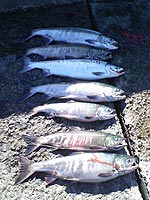 (^-^)ぼちぼち掛かり始めたようです。先端の方ではロッドがナイスなカーブを描いているみたい。ワシたちの周りはぱっとしません。しかーし、待望のファーストヒーット!!前あたりの後、食い込んだのを確認してロッドを軽くアワせます。なかなか重い。しかし、手前で痛恨のバラし(ToT)その後すぐトシにもヒット!!ハラハラドキドキものでファイト中です。実は鮭釣り今日初挑戦のトシ。なんなく1本目をget☆