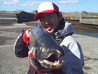 どうやら爆釣タイムに突入した模様。先端付近は酒の1本釣り状態。そうこうしているうちにワシにもヒットしちゃいました。新調したショアジギ用タックルがいい感じに曲がってます。今度はしっかりget。ナイスな体高の♂。すぐキャストするとまたバイト。強烈にフッキングするとふわっとかるくなってしまいました。みなさんPEは傷が付いていないかこまめにチェックしましょう。