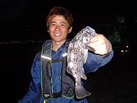 ショートバイト等、渋い状況は相変わらずですが、そんな中で見事フッキングさせたのは1/16オンスジグヘッドにワームはグラスミノーで挑んでいたNODAちゃんでした。 ソイにしては良い引きするんじゃないの!って見ているとやはりアブ姫!サイズはいまいちだけど貴重な夜アブを手にしたNODAちゃんはご満悦(^O^) 続けてヒットさせたNODAちゃん!これも元気に突っ込む魚です!ロックスウィーパーをここまで曲げる見るからにナイスなお魚! 正体は何かと気になり駆け寄ると余裕で30UPのごっついソイでした〜おめでと〜! これは嬉しい1匹でしょうな(^O^) ;)