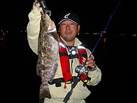 現地に着くなり刺す様な冷気にワクワクしながらのリグセッティング。 表層に浮いてるヤツはまずいないだろうとソリッドブラックのグラスミノー&3/16OZイワシヘッドで1投目からボトムを取りリフト&フォールで様子を見るがいきなりの根がかり(*_*)うぬぬっ、やはりシーバスロッドは根がかりが外しにくいですf^_^; 次にリグったのはミノーMの青バチカラー、ジグヘッドは再び3/16ozのイワシヘッド。 リフト&フォールに時折バンプを織り交ぜて手前まで探ってきた時、バンプからのリフトにガゴン!とゆう「なんだ!?」ってゆうバイト! ゆっくりラインスラックを巻き取り、ふんぎっ!とジムばりのアワセを入れ(ロッドが柔らかいため)るとフッキング!ソイだとばかり思っていたためにその引きはとんでもない時限のものでした(^O^)一人であまりの引きにおほほほ〜っと大笑い(^^)