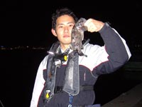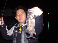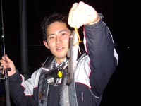 次にかけたのは隣りでスーツ姿にウエアを羽織った、ボトムを意識した釣りをしていたふじもっちゃんでした。 これもなかなかの突っ込みを見せてくれています。 上がってきたのは30cm弱のなかなかサイズのクロソイでしたが、本人はアブをキャッチしたかったらしく少々不満げでした(^^) よし次はおいらが!と意気込んだんですが、次もかけたのはふじもっちゃん!? よしっ…あれ?引かね〜…けどなんかついつるなぁ〜ってな感じであがってきたのは23cm程のハゼ(^^)今日はフィッシュイーターな気分なんでしょうかねぇ