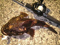 同じパターンで続けてズズン! これはなかなかの重量感! フロロ20LBを使っていたのでそのまま抜き上げキャッチ〜入れ替え成功っ!(^へ^)b さらなるデカカジカに期待してラインをチェックしリグはそのままで再度船道へちょいっとキャスト。 遠投すると比重の大きい太いフロロラインを使っているためスローなリフトをした時に浮き上がりずらく根がかりが多発するためにあえてのゆる〜いキャスト。 するとまたまたおいらにズドン!とゆうごっついバイト! お!なかなかのアブラコだ〜お、お、お〜ほほほ〜って思わず笑いが(^O^) しかし浮き上がって来たのはナイスなカジカ! 抜き上げるとゴリゴリ鳴くトゲカジカでした〜(^へ^)v トゲカジカ、かなり引きますね〜実はおいらトゲは初めてキャッチしたんす。鳴くのにも驚きました(^^)
