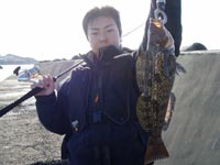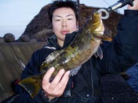 その後、潮が止まり、沈黙の時間が流れる。そのうちにいきなりの重量感。これも大型のカジカに違いないと思った矢先のラインブレイク・・・。どうやらラインが歯に触れて切れてしまうようである。トウベツカジカか?その後小さな魚と戯れつつ、終了間際に42cmのアブラコを釣り上げ終了となりました。