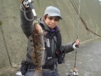 「なんとかアブラコが釣りた〜い!!」 で大澗漁港へ移動しました。 釣り始めて早速ガルプクロー3インチで「ゴンッ」といういいアタリが、慎重にアワセを入れるとグングン引く!! ようやくアブラコGET。しかも40UPのいいサイズが出てくれました。 そのあとバグアンツ3インチ三陸リアスレッドにチェンジしてすぐにまたバイト!! 今度のは強烈!! アワセを入れるが乗らない・・・バラシ・・・・???!! その場でしばらくステイさせ、小さくアクションを入れるとまた「ゴゴンッ」と食ってきました。 引きも強烈で上がってきたのはまた40UP!でさっきのよりデカイ。 この日は短時間に40UPが2本出て満足の釣行でした。