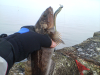 13日、ホッケを釣りたくて朝に江差に向かいました。しかしジモッティ曰く「今年はいない」とのこと。早々に見切りをつけ、森まで一走り。早速新港外側を探りますが、ちびアブのあたりがあるだけ。ほぼ全部ランガンしましたがダメでした。それならばと、旧港に向かい撃っていきます。自分はチカが泳いでいたので、バークレイ バスミノー3"ウォーターメロンのスイミング。トシはバークレイ パワーホッグ4"グリパンブラック(トシ仕様)(笑)で探っていきました。早速、自分に待望のバイト。しかし「コン」で終わったのでイライラ作戦を決行!!(ただのシェイキングです)すると「ガツン」。やっとファーストフィッシュです。こんな感じでもう1匹追加。
