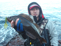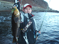 今日はmooさんと南茅部方面の磯に行ってきました。現地に着くと、とってもいいカンジ!!二人ともテンション高くなってます。まずはシャローのほうを探ろうということで、キャスト。mooさんが1投目でヒット!!しかしバラしてしまいました。ロックスイーパーRC−702EXHがいい感じに入ってましたよ〜。「お、今日も幸先いいねぇ」なんて思っていると、強烈なバイト!!すかさず、のけ反りフッキング!!ロックフィッシュボトムXHCがバットからブン曲がってます。根に潜られそうになったけど何とか浮かせると「でっけー」。mooさんにランディングしてもらって(ありがとうございました)、計測すると52cm!!一発目からいい出だしです。!