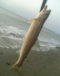 様々なミノーでここぞ!という場所をひたすらトレースするものの反応無し(^_^;) 後ろで見ていた地元のおじいちゃん(^^) 「おんや〜ずんぶとぶなぁ〜 どごさいったんだがわがんねぇなは」 「さぐらますだっけまだはええべ」 「まだはえ、まだはえっての」 (^_^;) てか黙って釣らせろっつ〜の!(笑) お〜し黙ってそこで見てろ!ってな感じで先日インパクトで購入した「タイドミノー120サーフレッドシャイナー」にチェンジ 小さなワンドのど真ん中からフルキャスト!ワンドの深みの真上辺りを速巻きでリトリーブ最中!ゴゴン!やったぁ! アメマスとは違うマッチョな引きからすぐにさぐらます(^^)だと解りました! 少しドラグを緩め慎重にやりとりして寄せ波でサーフにズリ揚げて無事キャッチ!!! 後ろでおじいちゃんが「☆★○*?▲!■◎◆×◇!!!」 さすがのおいらも聞き取れない位のエキサイトぶり(^O^) すぐに写メ&写真を撮り、後ろで見ていたおじいちゃんに写真を撮ってもらいました。が… キャッチしたのはおいらなのにカメラを持つ手が小刻みに震えていたのは何故でしょう(^O^)