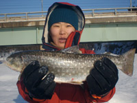 今回の高谷家の釣行はウミアメ!実は今まで冬はほとんど釣りをしない夫婦でしたが去年の後半から、あまりに嫁の調子がいいので今シーズンはガンガン行っちゃいます(笑) 気合が入ってる割には近場で済まそうって事で上磯方面で釣行。 9時頃からの釣行でしたがベイトフィッシュが多くかなり釣れる感じがします! 晴天の中、持ってるルアーを次々チェンジしてキャストを繰り返していると 「ドンッ・・・」 いいアタリ! ドラグを出しながらゆっくり上がってきたのはナイスコンディションのウミアメ48cm!!