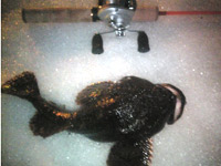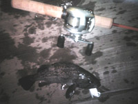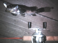 松倉川河口と違い、今度は幾分水深があるために期待を持ってキャスト! スピニングタックルには1/8ozのブラシンボ−ルのテキサスに パワーホッグの3インチ、ウォーターメロンをセット! ベイトタックルには1/16ozのジグヘッドにソリッドホワイトの パワーホッグ4インチをセット。 普通逆じゃん!的なタックルですが、ちゃんと理由がありましてq^o^p・・・ さまざまなパターンを試し、やっとの事でヒットパターンを発見!! キャスト、着水、カ−ブフォ−ルでボトムを切って、デッドスロ−リトリ−ブが今日のアタリパターンだったみたい! 幸先良く、ソイ君ヒット!