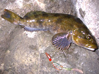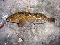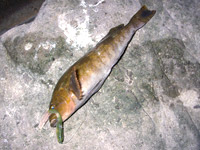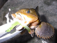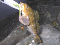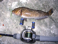 ボトム付近で「コンッ!」 小さいバイトが結構ありました。まずは33cmのアブラコ がヒット!