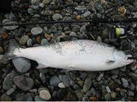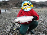 ガックリしてリールごとチェンジして場所変え。この日別車で来ていたT雄に携帯で連絡取ると、河口右岸でラッシュの最中とのこと。急いで駆けつけたときには、7〜8人いた釣り人の傍らには、それぞれ1〜2本のサクラマスが・・・。遅かった、しかし気を取り直してキープキャスト、みんなが疲れてキャストを休んでサクラマスを眺めて談義に花を咲かせている間も、キャスト。すると、コツンというアタリが、2〜3回続く。「いる」そう思って、投げなおしたのはディスタンスビクセン 28gのチカカラー。手ごたえの前にいきなり閃光が走る。直後にジャンプ、ドラグが容赦なく出される。活性が高い。暴力的なファイトだ。周囲の釣り仲間の協力を得て、ゆっくり持久戦に入る。なかなか弱らない。5分くらいはファイトしただろうか・・・