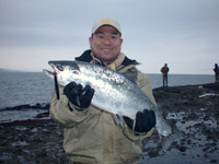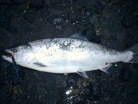 向風がかなり強くなって、ミノー ではキャストがキツクなってきましたが、根性でキャストを繰り返していると「ゴンッ!」・・・ジイーーーー!!やっと本命ヒット!!寄せてくると、ガッチリ掛かっているのが見えたんで、比較的楽にランディング!今季初のサクラマス!!