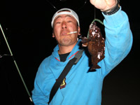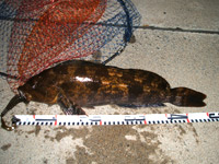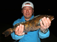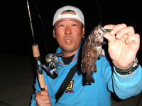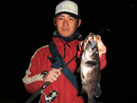 風が出てきてボトムを取るのが厳しくなってきたので1/8ozのジグヘッド&ジッパーワームにチェンジ!!今度はきっちりボトム取れます!バニッシュ5lbナイスなラインんですb(^へ^) リフト&フォール後のボトムシェイクで「ゴン!」いいアタリ!アワセを入れてやると「重っ!」とたんに、ドラグが鳴りはじめ超シャローで掛けため右へ左へ走り回る!その魚は引きの感触からしてアブラコなんだけど、こんなに走るの?って感じでした。 NODAちゃんのタモ入れで無事にキャッチ☆