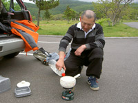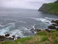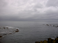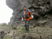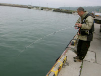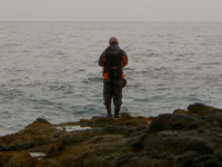 一応、磯に降りて釣りをしてみますが、1ozでも流されまくり状態!! まったく釣りにならない状況なんです・・・写真では解りずらいですが、かなりの高波でbabaちゃんはこの直後、頭から波をかぶってました(笑) 危険なので中止して移動する事に・・・ 「みなさんも、このような状況の時は絶対に無理しないでくださいね!」