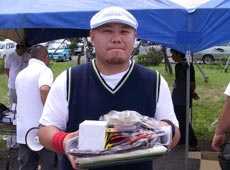 しかしその1本がなかなかでない。残り時間も少なくなってきた。10時をまらり検量が始まる、あと30分で競技終了だ やばい!あせる しかしそんな時ドラマは起こったのだ、「ごふっ!」今まで味わったことのない強烈なバイト!「ゴン!ゴン!」と首を振るると同時にドラグが鳴る!ロッドは見事に曲がる!全くあがってこないすごい重量感だパワーもすごいそのファイトを見ていた大会スタッフがネットを持って走ってくる「慎重に」と声をかけるが逆にプレッシャーだ その後もなかなか上がってこないもしや巨大な