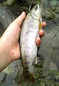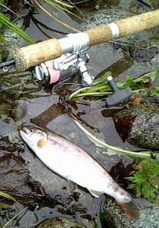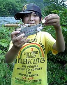例年にない長雨でヒラメにもいけない……何とか止んでも海の色が…考えあぐねた末、フレッシュをやることに底が岩盤なんで濁りが出ない事は知ってました。まず河口からすぐ近くでやったが小ウグイだけ・・・次に少し上の砂防ダムの溜まりへダイワのクルセイダー赤金をゆ〜っくり漂わすと、底から土色に変わった50はある魚体がっ!すげービビりました。しかしバイトは無し・・・それっきりでした。