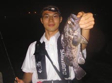 が釣れているとの事なので、その夜、仕事帰りに早速行ってみました。 ポイントに着いて、田嶋君は用意できていたのですぐに始めました。 僕も慌ててリグっていたら「キターーー!!」と叫び声が・・・ 始めてものの数秒で釣っちゃいました!しかも本命のアジです!!