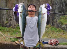 を狙って朝4時に実釣開始!5時30分に一匹目がヒット!その後もシャクリ続け、6時20分頃もう一匹良型をゲット!青物とのガチンコ勝負を征し、勝利のポーズ!!ヒットルアーはマリアのシーフラワーでした。