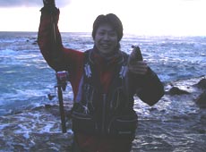近くにうねりの弱いポイントを発見!安全を確認してポイントに入ります。そのポイントは大きな溝に沖からの砕けた波が流れ込み、サラシができている絶好ポイント!そこでまたまた佐沼さんにヒットコール!