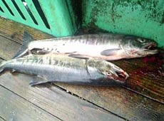 ここでサクラオヤジが先陣を切り、一本♂を上げるが群れがまとまっていなく後が続かないf^_^;それでも跳ねが頻繁に出てトリプルヒット(^O^)サクラオヤジも2本目♂ゲット!そして遂に僕にもアタリが!「ゴツゴツ、グ〜 グッ グッ」 「あ〜 あ・あ・ ふんぎっ!」あわせた瞬間フックがすっぽ抜けて痛恨のバラシ!!痛い!痛すぎる〜!!!インパクトで取り寄せて貰ったリセントの「ぐるぐるサーモン」でのヒットでした。その後は長万部沖、静狩沖にも移動したが、跳ねるものの単発に上がる程度で結局船中7本の大貧果で終わってしまった・・・1時には帰港しました(^^ゞ またリベンジを誓います!