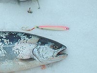 佐々木です、今シ−ズン初釣行で1/21熊石に遠征しました。べた凪で出ればサクラだと思い頑張りキャストをしていたら9:30頃、小さいながら45pのサクラを釣る事が出来ました。ヒットルアーは岡ジグAT30 インパクトオリジナルカラーのピンクグロー