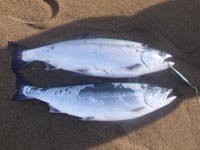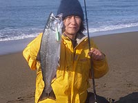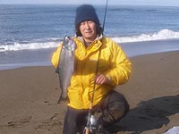 1月28日 インパクトの釣り仲間から「江差方面で釣れてるらしいよ」と連絡があり 「こうしちゃいられない!」と昼過ぎに島牧を出発、午後2時半くらいに合流 夕マズメをAT30アカキンで小型のサクラマスをヒットさせるもその後反応は無く終了、仲間うちでも釣果は無く・・・岸近くをヒレを出してもじったりしているのですが、反応してくれません・・・午前中に釣果が良かったと言うことで翌朝に狙いを定め、ブリのジギングでお世話になった北斗丸の民宿に一泊して翌日の朝に北斗丸の笠谷兄弟と一緒にサクラを狙いに出かけました。しかし昨日背びれを出して泳いでいたサクラの姿が見当たりません手前のワンドをあきらめ昨日の夕方に釣れた場所へ移動しました。するとサクラが跳ねているじゃありませんか!AT30アカキンからマジョーラグリーンに変えた一投目でヒット!さらにもう1匹を追加して午前9時過ぎにあたりがなくなってきたので終了。ワンドを狙っていた笠谷兄弟にも1匹ヒット、この日は全体で3匹釣れました。まだ1月という事もあり日によってムラがあるようです。次回に期待です!