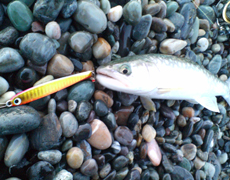まずはDOUタイドミノースリム175をキャストするも反応ナシ!次々ミノーをローテーションするもダメだったので、「こりゃぁ、沖を回遊してるんだべ」と思い、岡ジグAT30赤金をフルキャスト!100m位ぶっ飛びましたわ!ラインスラッグをとり、ジャークを一発。「ドン」!久しぶりの魚の感触!ちっこいけど1ヶ月ぶり、そして初島牧でのファーストフィッシュ。嬉しかったっす。 岡ジグをガッチリ加えてますよ〜。