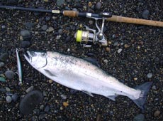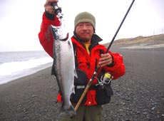 後に続けとおいらもタイドミノー135サーフのマイワシにチェンジ! ジャーキングでゴゴン!ジィ〜イ〜とドラグを鳴かせてくれたそいちはボウズマンもうらやむなかなかのサクラマス(^O^)v やりぃ!