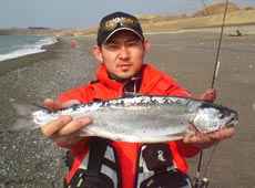 その後、撃ちましたが昨日より活性は高そうでしたが、ルアーには食い付かないので場所移動。 少佐に連絡を取ると、上の国であがったとのこと。ダッシュで駆けつけました。(もちろん安全運転でね☆) ボウズマンさんと少佐のから教えていただいたメソッドでやると、開始30分後にヒット!! グングングンと走りましたよー。 小ぶりですが今季初のサクラマス!嬉しかったぁ(#^.^#)