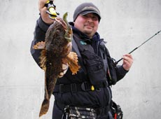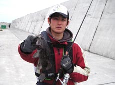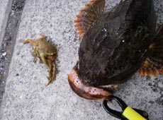 と容赦なく電話を切り ファイト開始!舟と岸壁の間を探っていたので すっかり舟の下にもぐられてしまいロッドを水面に入れて無理やり巻いてくると・・・あ・・・カジカだ・・・デカイ 写真撮影そして電話をかけなおす