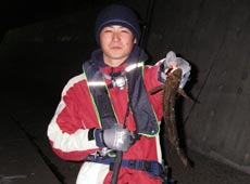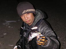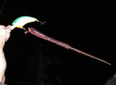 まずハードルアーで様子を見ようとキャスト。薄暗い水面を見ているとゴミが浮いてる様子。ルアーを回収してくると「やっぱりゴミが引っかかったよ」とゴミを取ろうと思った瞬間「ぐわっ・・・動いた〜〜〜?」ライトを点灯すると・・・