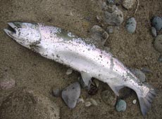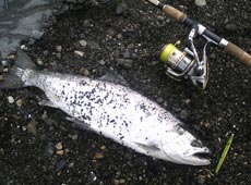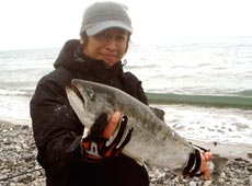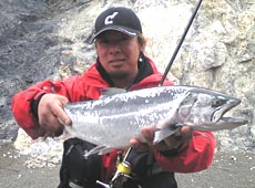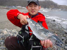 やっとの思いでろぎゅ達のもとへとたどり着くと、朝一はクリアーだった水色も、向かい風が吹き始めてうねりが高くなってきていて少々濁りが入り始めていました… 急いで打ち込み始めるおいらとふじもん(^O^) やはり気配はムンムンでふじもんの目の前で鮭稚魚を狂ったように追い回す櫻ちゃんを目撃するほどでした。ふじもんのキャストしたジグに目の前までチェイス有り〜の、おいらの
