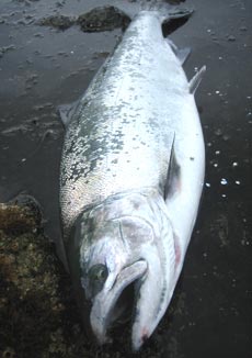 を投げて30分経ったか経たないかした頃、ドスンという感じのアタリと同時にパワフルな引きでラインを引き出して行く魚。待望のヒットに、誰も居ない岩場で1人ニヤニヤ…端から見たらさぞ気味悪かっただろうに(笑) 勢い良く走った割にファイトは長続きせず、以外に降参は早かった。寄sせてからあっさりネットイン。 全長は57cmながら重さは3kgオーバーと、ウワサ通りのナイスボディー。 今回は目標の60オーバーゲットには至らなかったけど、キングサーモンのような見事な幅広の魚に大満足。 また今度、目指せ60アップ、4kgオーバー!で行ってきます。