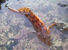 隣の磯に移動。 ここでHさんも合流し、釣りを再開! 私にもアブラコ(アイナメ)がヒット!小型でも磯のアブラコ(アイナメ)のファイトは強烈!! 上がってきたのは赤みの強いきれいなアブラコ(アイナメ)でした。 ベイトブレス・ラッシュクロー4インチです。 ファイトを楽しんだ後は優しくリリースしました。ありがとう!