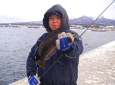 風も強くなりポイント変更。風をかわせる場所を見つけまた釣りはじめる。このポイントもヘチ際にケーソン(ブロック)が沈んでおりその隙間を丹念に探ってみるが・・・バイトがあるもののフッキングしない・・・ 苦労の末やっと私にヒット!しかしまたまた