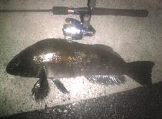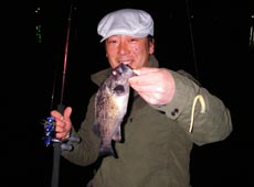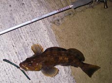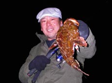 4人でしばらく撃つが反応が無くなった為にプチ移動をして、もう一匹釣ったら帰ろうと思っていた矢先、離れていても聞こえてくるイグジストの渇いたドラグ音に、お!?と見上げると、Kくんが遠投パターン(たぶん)でクロソイをキャッチ!と次の瞬間!久々にドン!!というナイスなバイトであがってきた35cm位のカジカ!!ラインが5lbだったがためらわずに抜き上げ無事キャッチ (^ 皿 ^)v