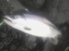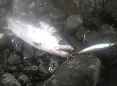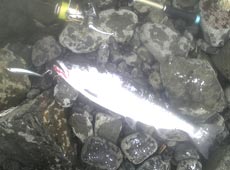 まだ居るだろうとすかさずキャスト〜!しかし手前までリトリーブするも反応が無いf^_^; ピックアップしようとガ〜っっと巻くと同時にギラン!ゴン!!目の前での反転食いに無意識に体がアワセを入れる(^O^) するといきなりローリングしまくり…スポン! あ…バレちゃった(:_;) その後もルアーチェンジを繰り返し、キャストを繰り返す。だいたい数にして10投に1匹って感じで久々に味わう夢のような時間に酔いしれながらキャストを繰り返すが、3匹キャッチし2匹目をバラしたあたりからチェイス時のルアーとの距離が段々と遠くなり、次第に反応が悪くなりフィーバー終了〜