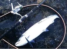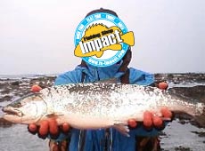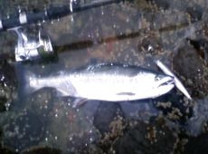 day2 昨日良い思いをした僕とサクラおやじ。今朝は北檜山の太櫓方面です(^O^) 海水浴場左の岩場に午前4時30分に入りました(^O^)昨日釣れたデュオ・タイドミノ―スリム140を最初からフルキャスト!変則トゥイッチを入れながら引いてくるとサクラマスがチェイスしてきて瞬間的にバイト!そしてギランギランと反転!な・なんと1投目でヒットです(^^)v 案外楽に寄せてきてネットインしたのは昨日より小型の47cmのサクラマスでした(^O^)