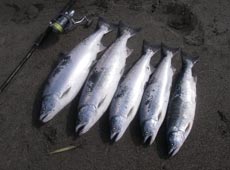 6月20日夜明けとともに黒岩海岸に入釣。海を見渡すと潮目が出ていたので潮目にむかってキャスト!初めてすぐに1本目のサクラマスをゲット!その後短時間で立て続けに3本をヒットさせ、5本目は”最後”と決めたキャストでのヒットだったそうです。遡上前であまり鱗もはがれず、あまりにもバタバタと立て続けに釣れたのでカラフトマスか?と疑ってしまう程だったそうです。サクラマスが5本も釣れて大満足な釣果ですが、実は本命はヒラメだったようで「本命は次回に持ち越し」と意気込みを見せておりました。また良い釣果がありましたら情報をお待ちしております。ありがとうございました。