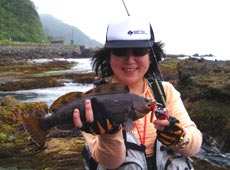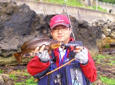 更にラン&ガンを繰り返していくと、沖目の岩付近にサラシの出ているスポットを発見!期待を込めキャスト!「ズシッ」とした重量感。根がかり???大きくロッドをあおるとなにやら生命感が!?釣れちゃいました!(笑)キャッチしたのは40センチ後半のメタボリックな