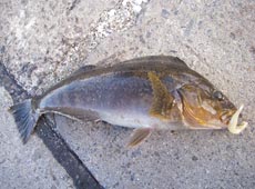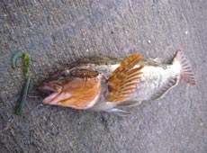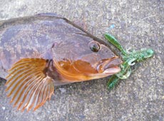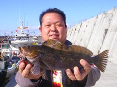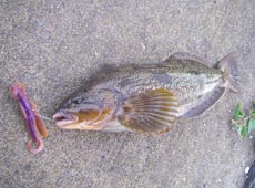 一通り探り終え場所移動。次のポイントでエコギア・ミノーSにチェンジ。リフト&カーブフォールで狙うとまたまたきました♪けいすけさんも同じポイントでゲット!お互いに40センチ位のグットコンディションのアブラコ(アイナメ)でした。
