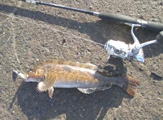 沖めの反応がなくなってきたので防波堤際をエコギア・ミノーSのライトテキサスリグを使い、小刻みにアクションを加えながら誘ってくるとアブラコ(アイナメ)がヒット!