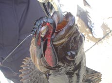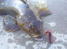 「男はデッカく行かないと!」と4インチ以上のワームで攻め続けていた加藤さんにアブラコ(アイナメ)がヒット!ノリーズ・エスケープリトルツインをガップリくわえています。男を見せた加藤さんに脱帽です。