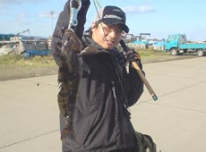 あ・・・また釣ってる!「リミットメイク〜♪」40アップのアブラコ(アイナメ)がヒット!エコギア・バグアンツ2”でのヒット、テキサスリグではなく細軸のジグヘッドで使うのがコツだそうです。小さいアタリもしっかりフッキングに持ち込む見事な戦略がバッチリはまっているようでした。お見事!