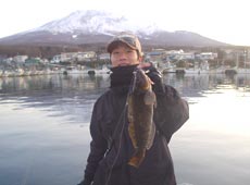 「やっときたー(笑)」今日釣れなかったらみんなにご飯をおごると強気の約束をしていたけいすけさんに待望のアブラコ(アイナメがヒット)大沼牛サーロインステーキの予定だったのに・・・(笑)
