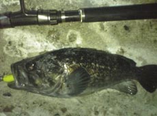 ボトムとって スローリトリーブでホッケ数本ゲット!次はテトラの横にキャスト!ボトムまで沈め、早めのリフトで中層浮かせそしてリトリーブさせるパターンでヒット!ロッド激曲がりで上がってきたのはナイス黒ソイ!!ヒットルアーはバークレイ ガルプ!・ミノーグラブ。