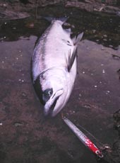 のお次は鮭稚魚(^^) リフト&フォールを繰り返すがイマイチ手元に動きが伝わらないため、段差フックをシングルに付け換え再度キャスト!! リフトの際にブルルッ!!ん〜これこれ(^^)とニヤリ ラインスラックをゆっくり巻き取りテンションがかかったところでスローリトリーブ…リフト〜フォール〜テロテロ…ゴン!!!おっΣ( ̄〜 ̄)アワセを入れると今度はガッチリ♪ 鋭いバイトとパワフルなファイト♪サイズこそ今時期のアベレージって感じだったんすけどf^_^;めでたく1本出やした(^O^)